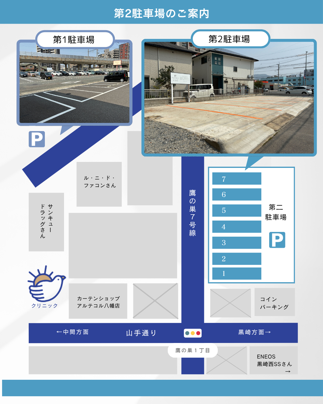 *第一駐車場:敷地内(サンキューさん横含む8台)・道を挟んだJA北九不動産さん横(縦列駐車前列7台)